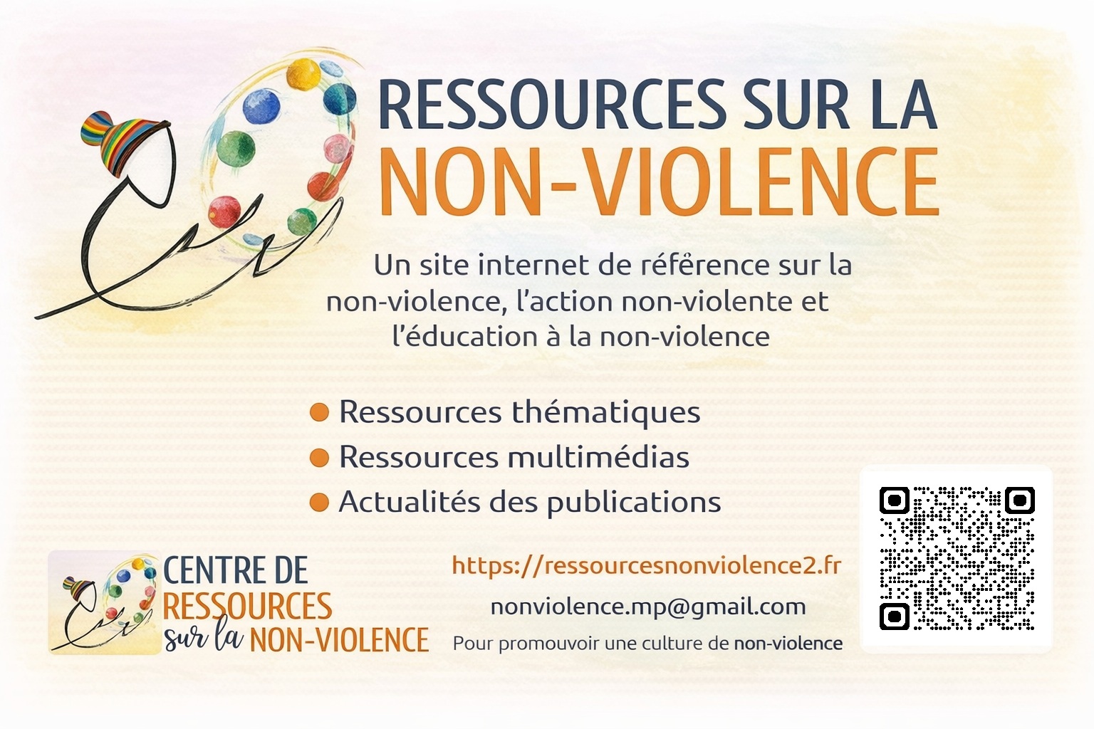 Actualités des publications : Ouvrages – Revues – Articles -Documents – Podcasts – Vidéos OUVRAGE – Léon Tolstoï, Le Royaume des cieux est en vous, Le Passager Clandestin, préface d’Alain Refalo 10 janvier 2026 OUVRAGE – La désobéissance civile, regards croisés entre la France et l’Italie, Julien Giudicelli et Sylvie Schmitt, L’Harmattan 29 décembre 202529 décembre 2025 ARTICLE – Qu’est-ce que la non-violence ?, par Jean-Marie Muller, revue Alternatives Non-Violentes 21 décembre 2025 TEXTE – Histoire de la défense civile non-violente : notions, recherches, expériences, Alain Refalo 10 décembre 202513 décembre 2025 REVUE – Alternatives Non-Violentes : L’espoir malgré tout ?, 4ème trimestre 2025 7 décembre 2025 REVUE – Silence : Voies autochtones, décembre 2025. 1 décembre 20257 décembre 2025 Toutes les actualités des publications Ressources thématiques Ressources multimédias Ressources thématiques Ressources multimédias Le Centre de ressources sur la non-violence Une association, un site ressources, des publications, des formations et des animations pour promouvoir la culture de la non-violenceAbonnez-vous pour recevoir la Lettre d’Infos bimestrielle Formations du Centre de ressources sur la non-violence Les formations 2026 du Centre de ressources sur la non-violence Colomiers, samedi 7 février AGIR FACE AU HARCELEMENT SCOLAIRE Collection Culture de non-violence éditée par le Centre N° 8 : La résistance civile, une force non-violente plus puissante N°7 : Jean-Marie Muller, penseur et acteur de la non-violence N° 2 : Découvrir la non-violence Webinaires – Capsules – Vidéos réalisées par le Centre Webinaire 2 octobre 2025 Conférence d’Alain Refalo – Le défi de la non-violence, 6 mai 2024 Partager : Cliquez pour partager sur Facebook(ouvre dans une nouvelle fenêtre) Facebook Cliquer pour partager sur Mastodon(ouvre dans une nouvelle fenêtre) Mastodon Cliquer pour partager sur Bluesky(ouvre dans une nouvelle fenêtre) Bluesky Plus Cliquer pour envoyer un lien par e-mail à un ami(ouvre dans une nouvelle fenêtre) E-mail Cliquer pour imprimer(ouvre dans une nouvelle fenêtre) Imprimer J’aime chargement…