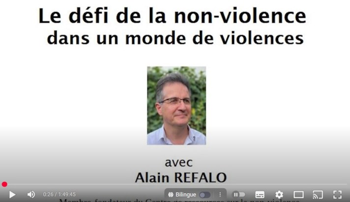 Webinaire de lancement du site internet Ressources sur la non-violenceJeudi 2 octobre 2025 Conférence d’Alain Refalo : Le défi de la non-violence aujourd’hui, 6 mai 2024 à Colomiers Partager : Cliquez pour partager sur Facebook(ouvre dans une nouvelle fenêtre) Facebook Cliquer pour partager sur Mastodon(ouvre dans une nouvelle fenêtre) Mastodon Cliquer pour partager sur Bluesky(ouvre dans une nouvelle fenêtre) Bluesky Plus Cliquer pour envoyer un lien par e-mail à un ami(ouvre dans une nouvelle fenêtre) E-mail Cliquer pour imprimer(ouvre dans une nouvelle fenêtre) Imprimer J’aime chargement…